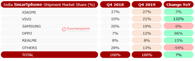 However, according to Counterpoint Research, this was not enough for the company to secure a 2nd place on the podium. Samsung India slipped into 3rd in Q4 and Vivo overtook Samsung to sit between it and Xiaomi.