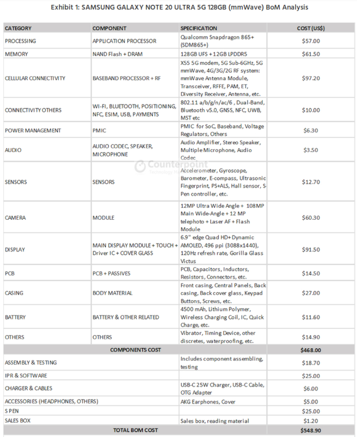 Refer to the table below for a detailed breakdown of the Galaxy Note 20 Ultra production costs.