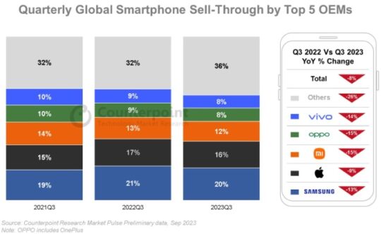 This year has been rough for all smartphone brands, including Apple and Samsung. However, thanks to higher profitability, they are in a better position compared to most other Chinese smartphone brands. Samsung captured a 20% share of the global smartphone market in Q3 2023, but it experienced 13% lower shipments compared to the previous year. Samsung launched its fifth-generation foldable phones, the Galaxy Z Flip 5 and the Galaxy Z Fold 5, during the quarter and managed to improve sales of the Z Flip device compared to its predecessor, thanks to a bigger cover screen and improved performance. The Galaxy Z Fold 5 had mixed results as it didn't bring any major improvement.