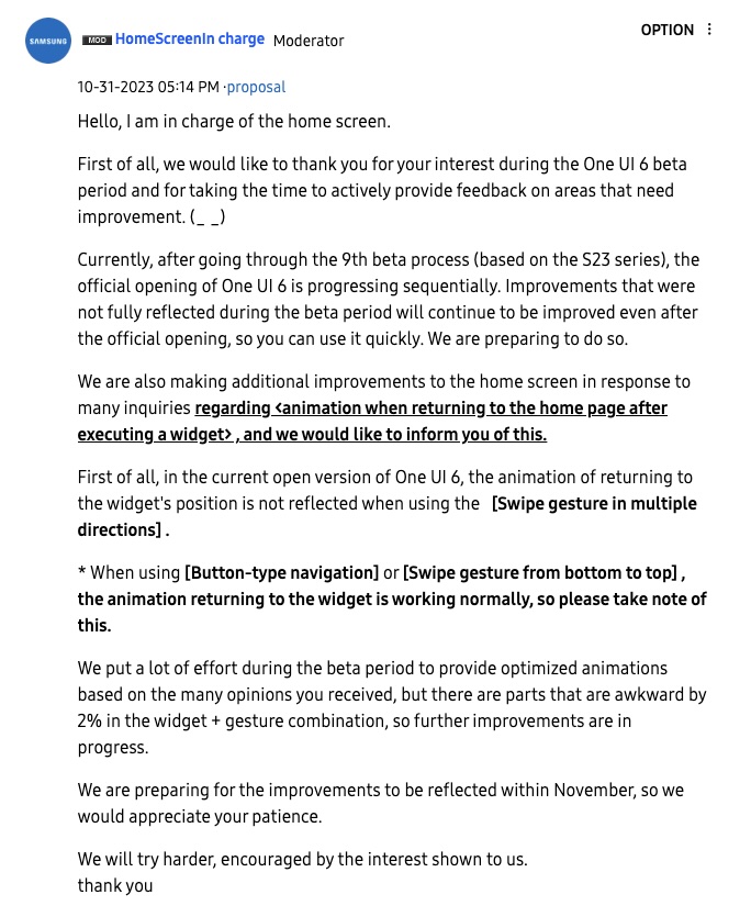 The company's forum moderator said that the developers improved animations and transitions in a lot of places in One UI 6.0 throughout the beta testing phase. However, they couldn't implement animations for app/widget opening and closing with the stable update. The development team is trying to bring smoother animations with the next update for the Galaxy S23 series, which will be released with the November 2023 software update.