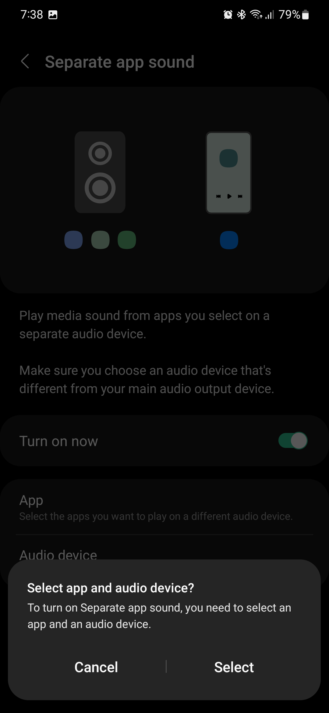 Tap the “Turn on now” toggle ON and tap “Select” in the pop-up window to choose which apps should play audio on an external Bluetooth speaker system. You can add or remove apps freely.