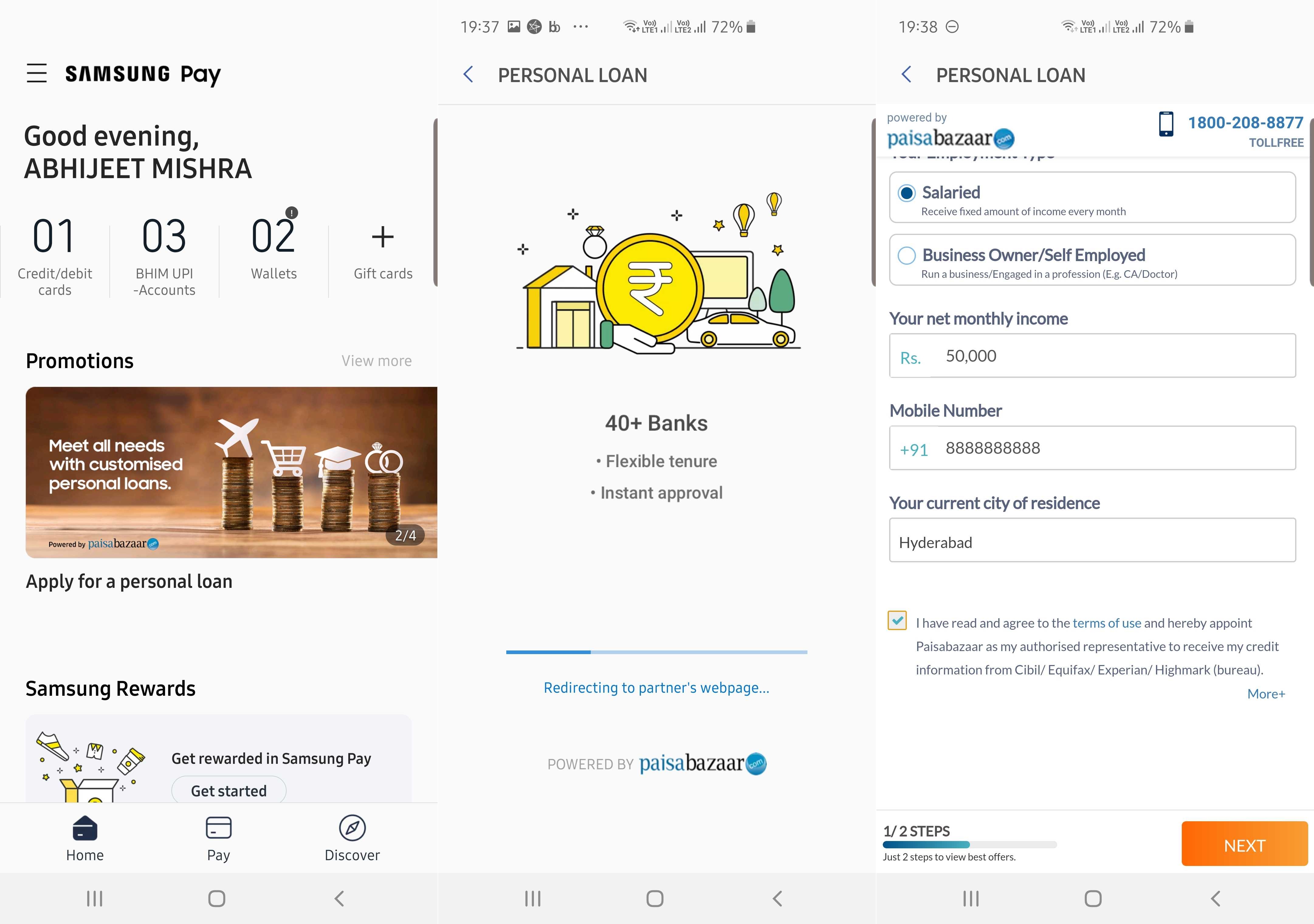 The implementation of Paisabazaar within the Samsung Pay app is not tremendously elegant. Samsung’s mobile app was barely changed in the process, but it now includes a link to Paisabazaar’s online form for credit card applications and loans. It’s not truly a fully in-app solution, but more of a simple way for Samsung Pay to make it easier for users to access the financial service’s online forms.