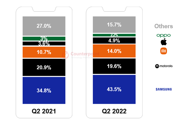 Samsung had a market share of a whopping 43.5% in Q2 2022, up from 34.8% in Q2 2021. Meanwhile, the second-largest smartphone vendor in the LATAM region, Motorola, lost a 1.3% market share and dropped to 19.6%, which led to the widest gap between the market leader — Samsung — and the rest of the pack.