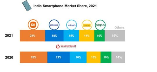 Samsung was the 2nd-largest smartphone brand in India in 2021 after Xiaomi. Shipments declined 8% Year-on-Year because of several factors, including supply chain issues caused by the global semiconductor shortage, as well as the absence of a Galaxy Note model.