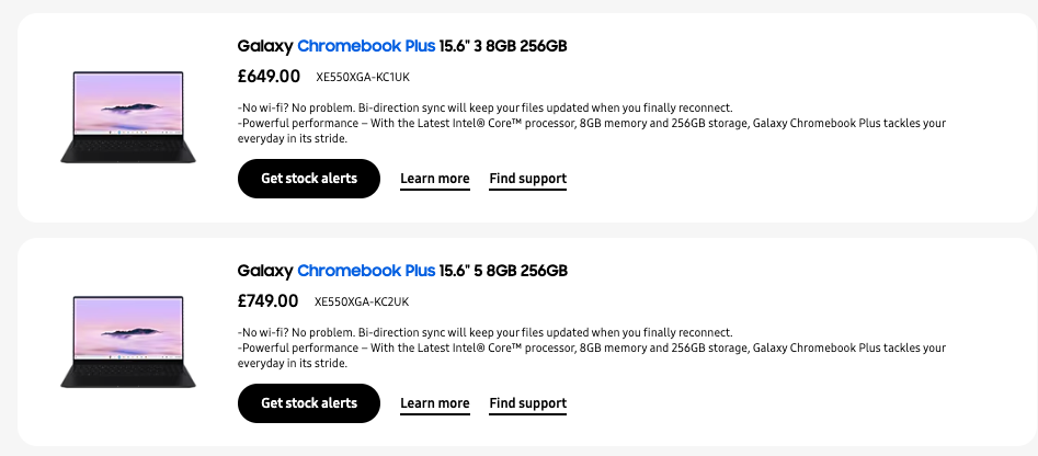 However, aside from the upgraded Intel chip, specifications look the same on both Galaxy Chromebook Plus variants across the board. They both have an Intel Graphics chip, 8GBB of LPDDR5X RAM, and 256GB of eUFS storage.