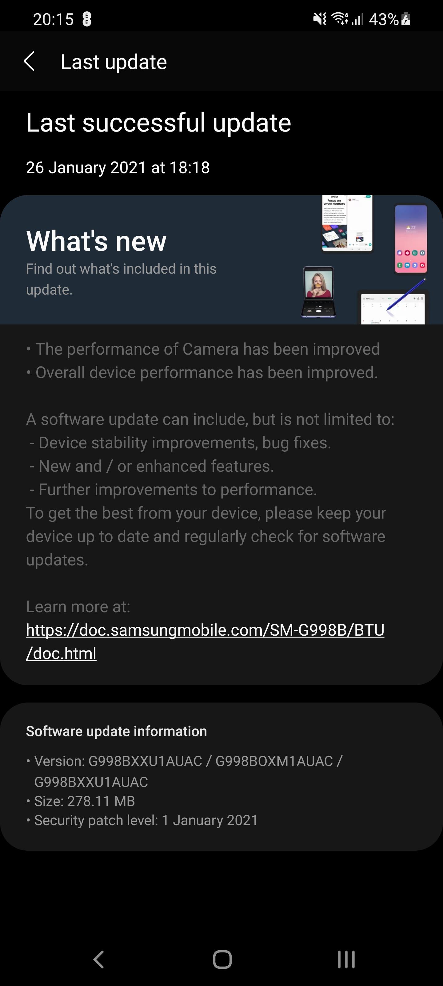 Update: A screenshot revealing the latest changelog for the Galaxy S21 Ultra firmware update was shared by a Reddit user. It mentions camera and overall performance improvements, and it weighs about 278MB.