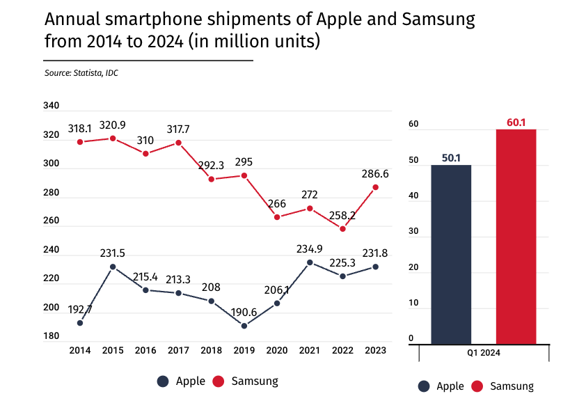 Samsung's worst year in the last decade was 2022, when it shipped 258.2 million smartphones worldwide. At that time, Apple recorded 225.3 million shipments.