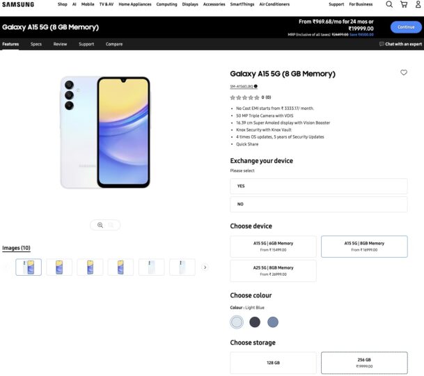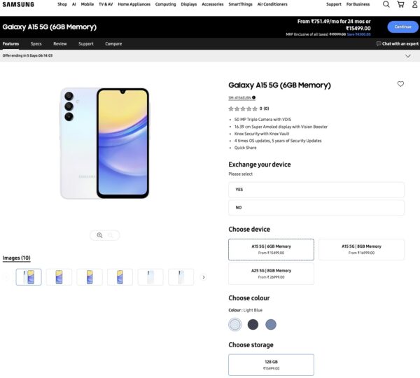 With that, Galaxy A15 5G costs INR 15,499 for the 6GB + 128GB model, 16,999 for the 8GB + 128GB variant, and INR 19,999 for the 8GB + 256GB version. The new price is live on Samsung’s official online store (website and app) for India, as well as on Amazon. However, the latter says that it is a ‘Limited Time Offer.’