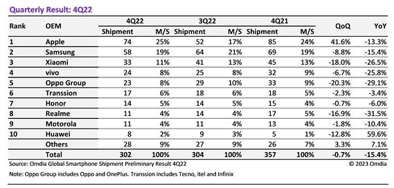 It was Apple that ruled Q4 2022 with 74 million units of iPhones sold, and its shipments increased by 41.6% from the previous quarter. But it saw a decline of 13.3% YoY. Speaking of the South Korean giant Samsung, it dropped from first place to second place recording a shipment of 58 million units in Q4 2022. It witnessed a drop of 15.4% YoY.