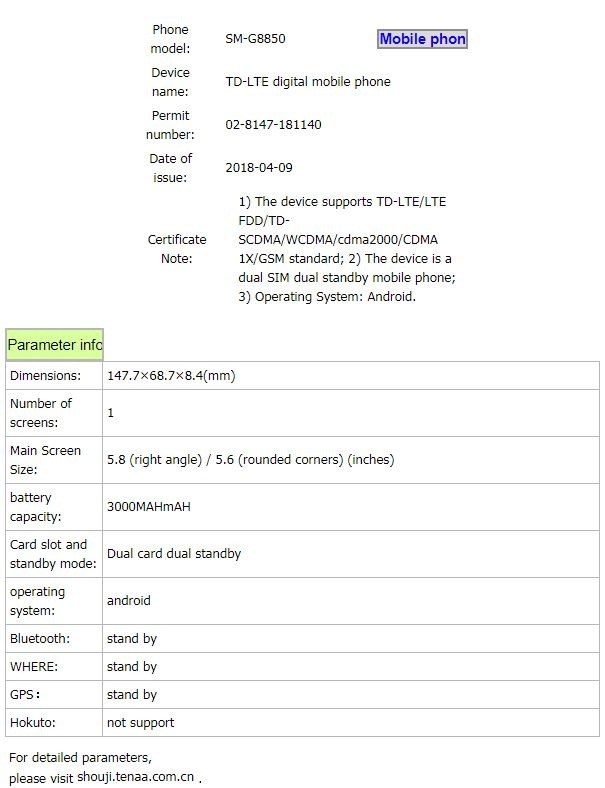 A few days ago, we heard that Samsung was working on a device with model number SM-G8750, which was alleged to be the Galaxy S9 mini. Well, now a Samsung SM-G8850 has been spotted at the Chinese certification authority TENAA's website, and since its model number stands above the SM-G8750, could this be the Galaxy S9 mini instead? Or maybe Samsung is working on releasing two variants of even the mini Galaxy S9 with different screen sizes, or perhaps launching one as the Galaxy S8 mini and another as the Galaxy S9 mini?