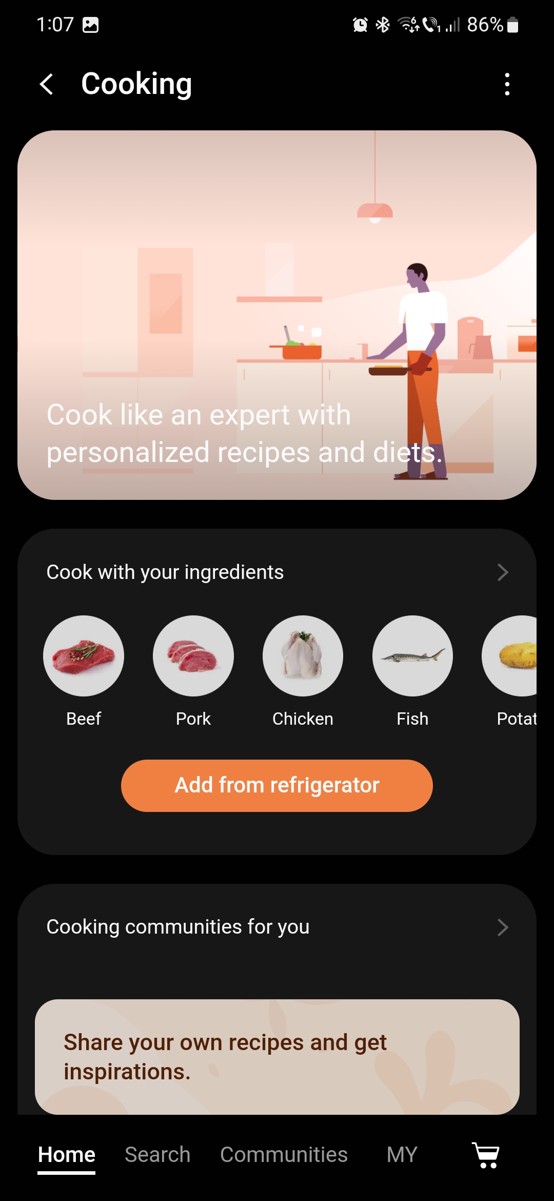 SmartThings services include SmartThings Find, Pet Care, Cooking, Energy, Clothing Care, Music Sync, and Home Monitor.