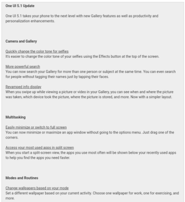 Samsung's official changelog mentions more powerful Gallery search and the revamped info display in the Gallery app, as well as the addition of the “Effects” button for selfies.