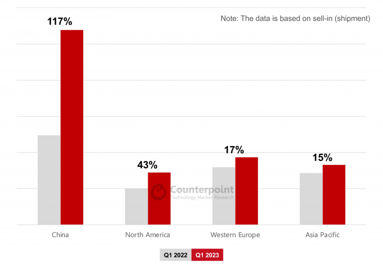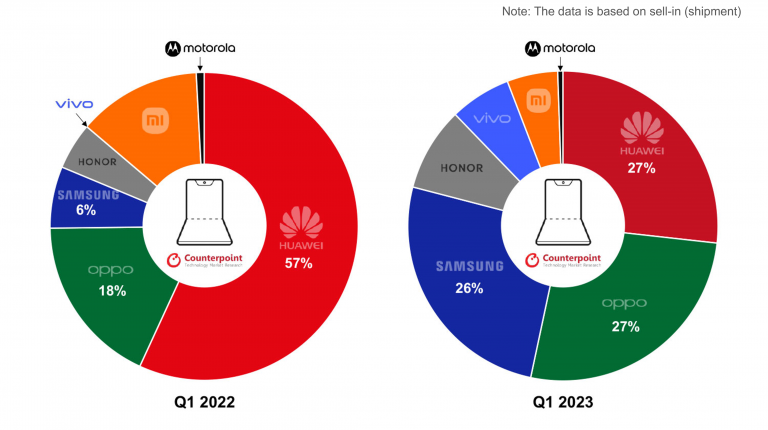 According to a report from Counterpoint Research, Samsung's market share in the foldable smartphone segment in China was 26% in Q1 2023, a massive jump from a mere 6% market share in Q1 2022. It was slightly (by 1% point) behind Huawei and OPPO, both of which had a market share of 27%. That's an impressive showing from Samsung compared to last year. And these figures seem even more special as Samsung had not even launched the Galaxy Z Flip 5 and the Galaxy Z Fold 5 when this report came in, and the company's new foldable smartphones could improve Samsung's market share even further.