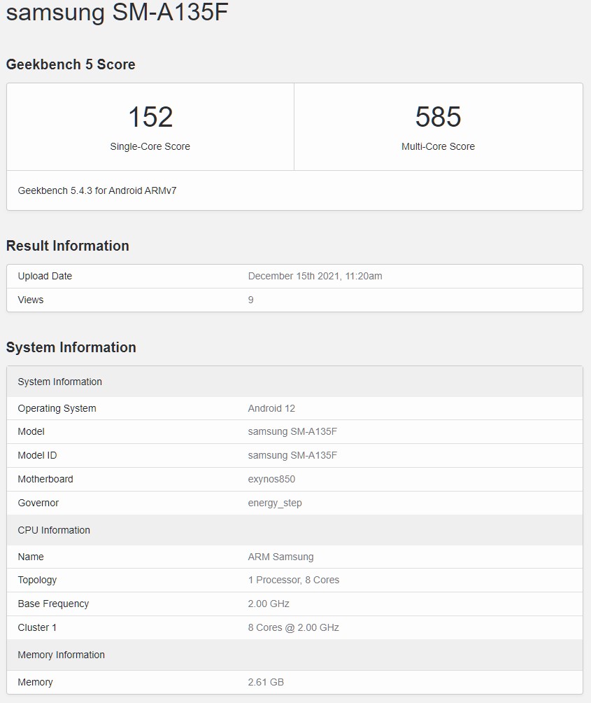 The company's next entry-level smartphone appeared in Geekbench's database, revealing its processor, RAM, and operating system. The Galaxy A13 (SM-A135F) appears to feature the Exynos 850 processor and 3GB RAM, and it runs Android 12 (One UI 4) out of the box, which means that it will get the Android 14 update.
