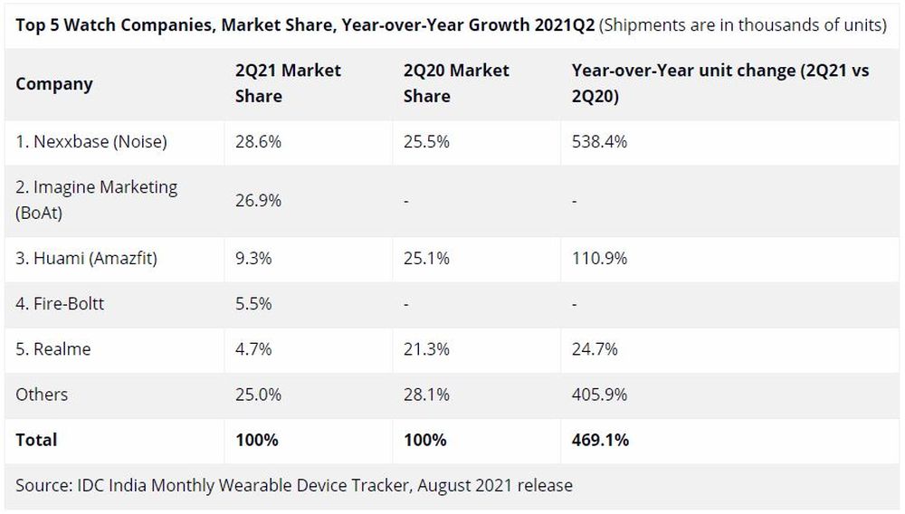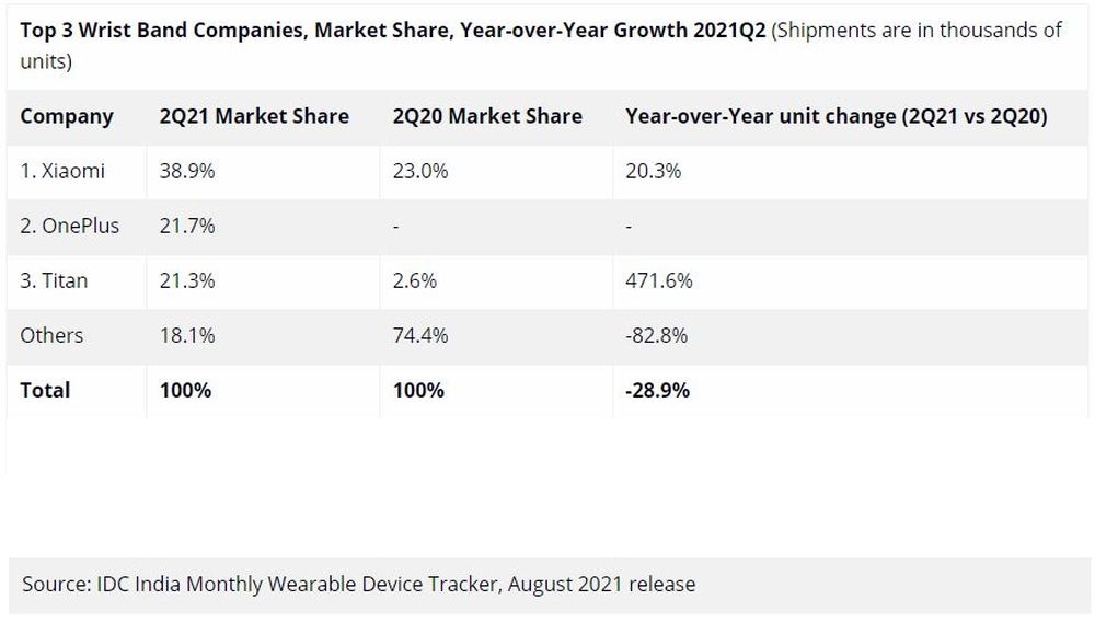 The top 5 smartwatch companies in India in Q2 2021 were Nexxbase, Imagine Marketing, Huami, Fire-Boltt, and Realme. Unfortunately, Samsung couldn't capture 4.7% or more of the market in Q2 to replace Realme, so it didn't make it into the top 5 list. Similarly, the three most successful wristband companies were Xiaomi, OnePlus, and Titan.