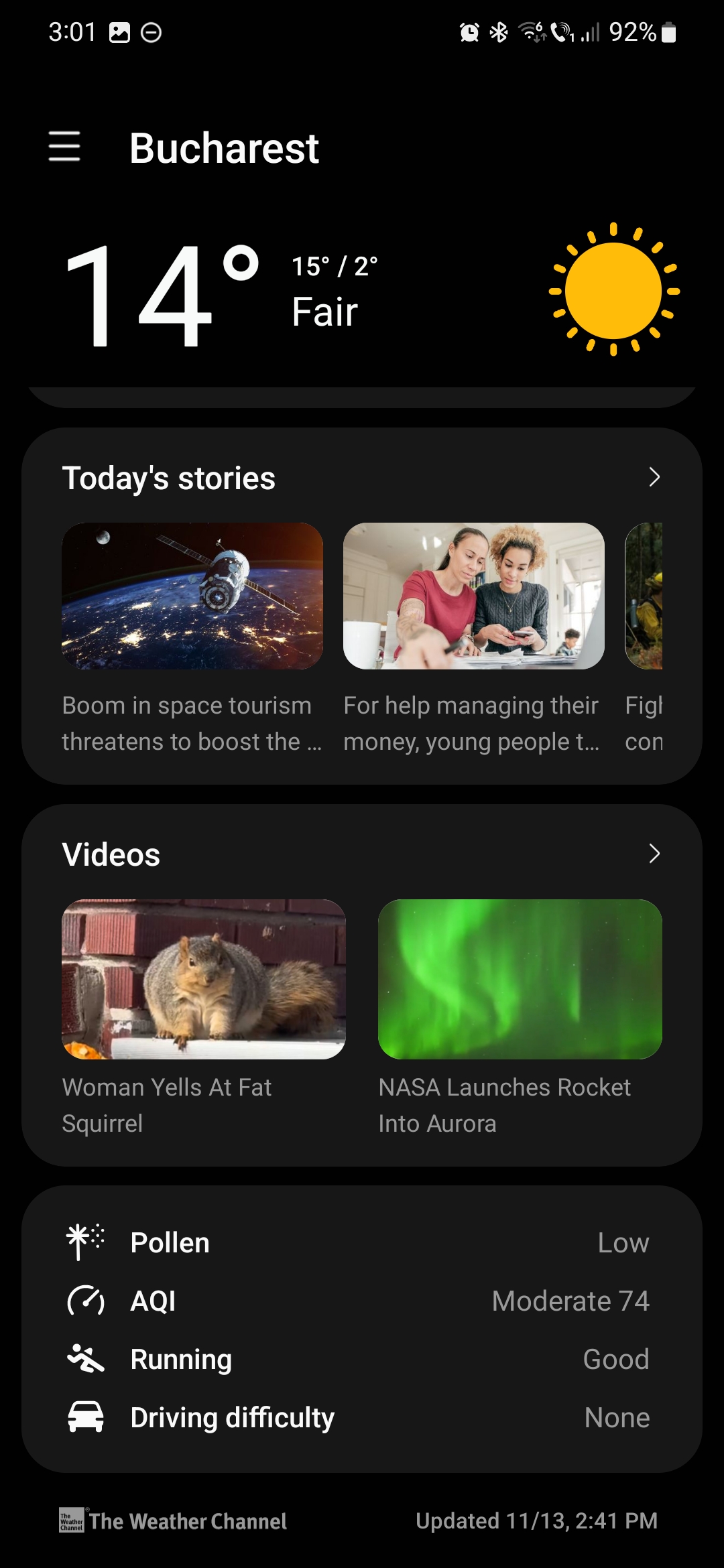 Lastly, by scrolling down at the very bottom of the Samsung Weather homepage, users can get information about pollen and air quality, as well as conditions for running and information about driving difficulty.