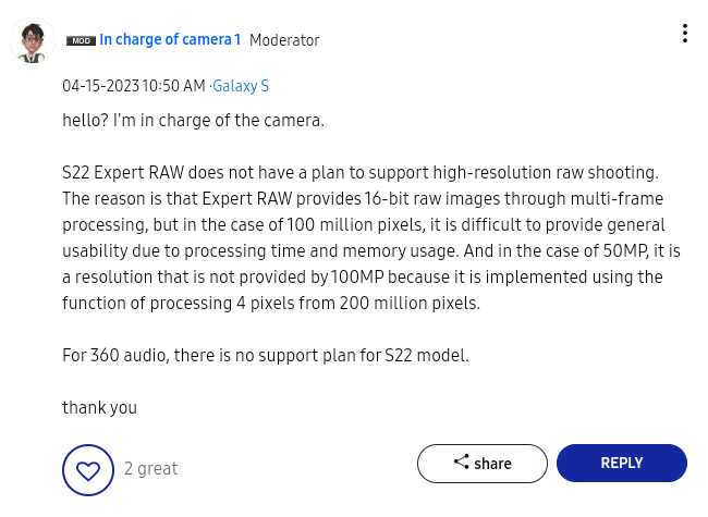 The Samsung Community moderator in charge of camera updates confirmed over the weekend that a couple of features that are available for the Galaxy S23 aren't coming to the Galaxy S22, namely: 360 audio recording and 50MP / 100MP high-resolution shooting in Expert RAW.