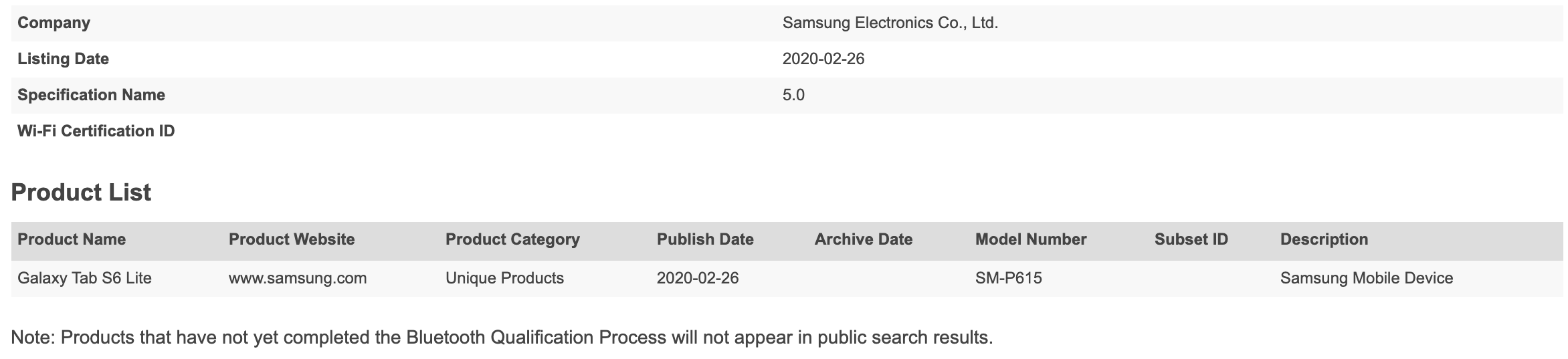 We exclusively revealed a couple of months ago that Samsung is developing a new tablet bearing model number SM-P615. Specs of the device emerged the following month. We now know what Samsung is going to call this tablet courtesy of the device going through its Bluetooth qualification process. The Bluetooth SIG listing reveals that this product, the SM-P615, will be called the Galaxy Tab S6 Lite.