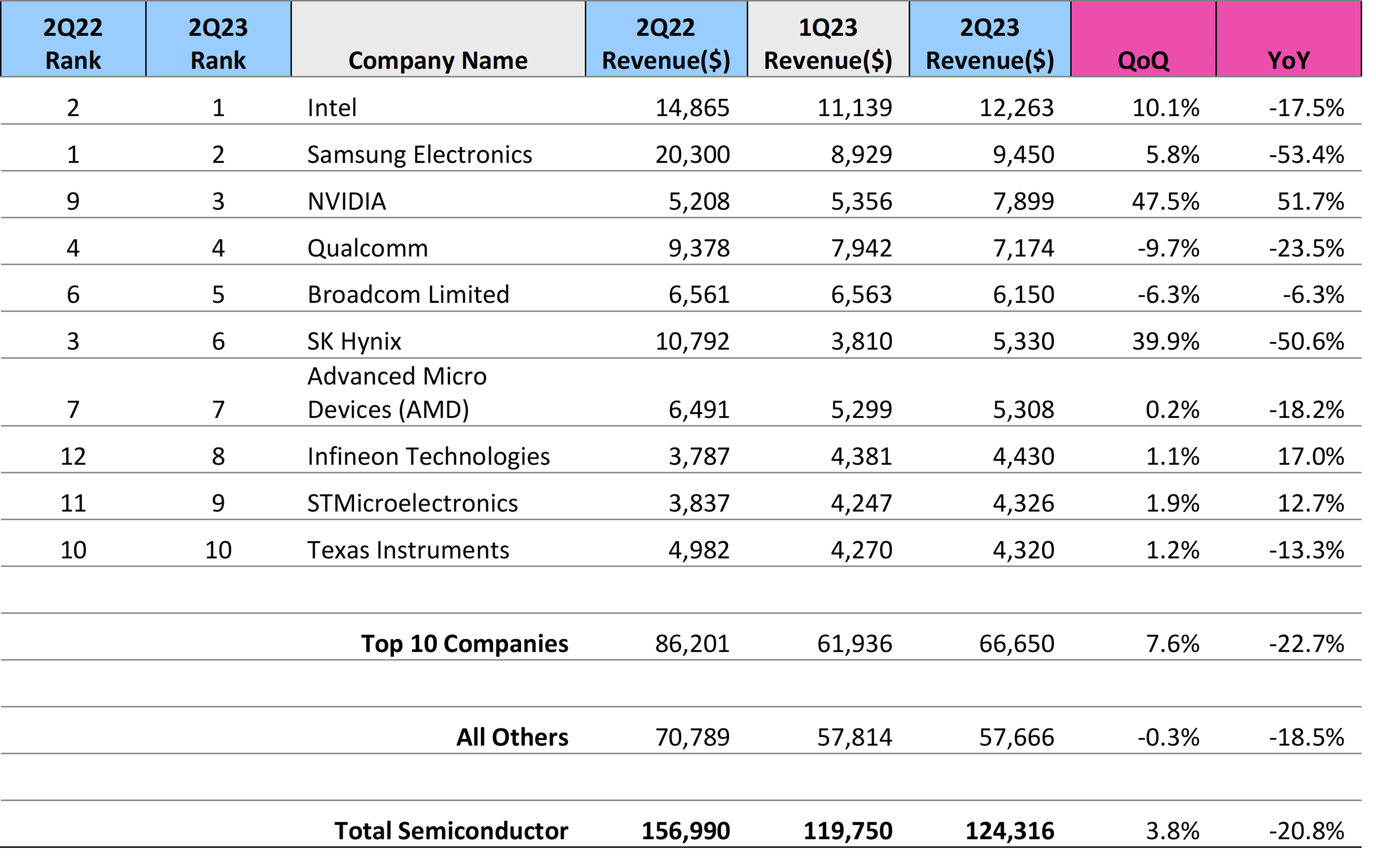 SK Hynix and AMD are in sixth and seventh position, respectively, with revenues of $5.3 billion each. According to Omdia, the semiconductor industry has grown by 3.8% from Q1 2023 to Q2 2023, with total revenues at $124.3 billion.