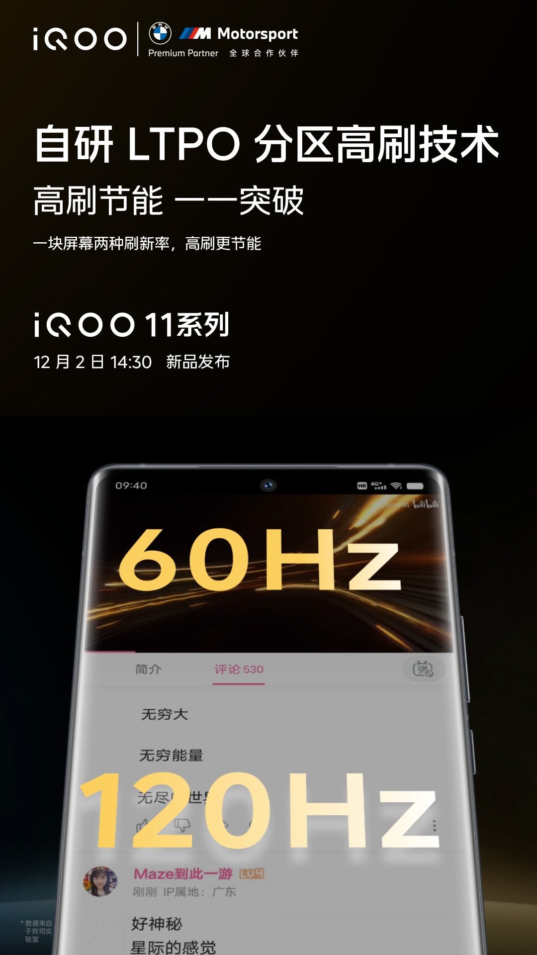 Similarly, Vivo's sub-brand iQOO is launching the iQOO 11 with the same E6 OLED panel featuring 2K resolution, a 120Hz LTPO 4.0 system, up to 1,800 nits peak brightness, and up to 1,440Hz PWM system. Interestingly, it can drive two separate segments of the screen at different refresh rates. For example, it can run a YouTube video at 60Hz in one segment and the comments system at 120Hz for smoother scrolling. This can further improve the fluidity of the UI while conserving battery life.