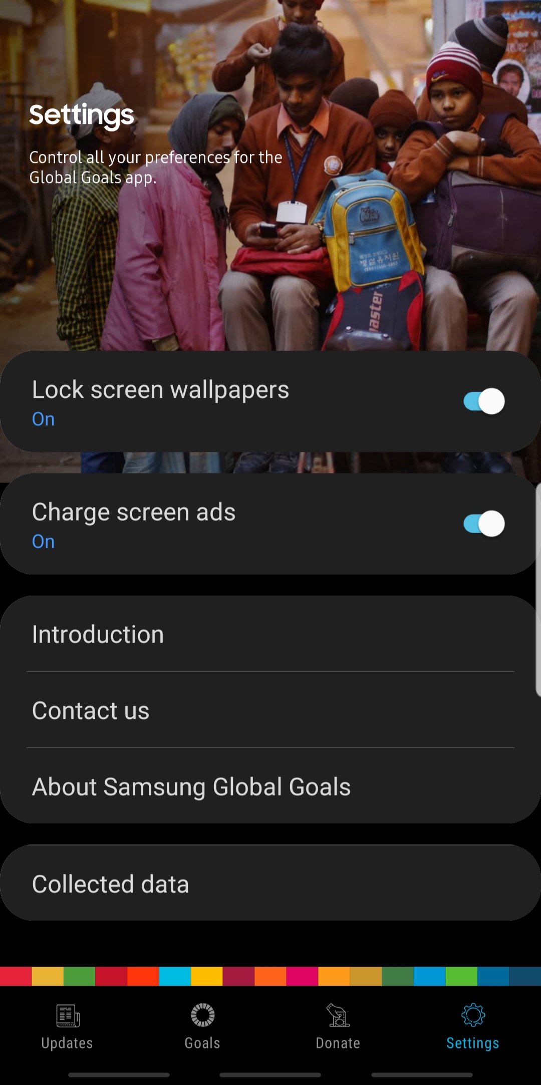 Upon launching the app for the first time, you are presented with an option to turn on lock screen wallpapers, which are either goal graphics or interesting quotes about a goal. The app has four tabs: Updates, Goals, Donate, and Settings. The Updates tab, as the name suggests, displays updates about the Global Goals. It also shows ads for other apps that you can interact with to earn money to donate to any of the causes.