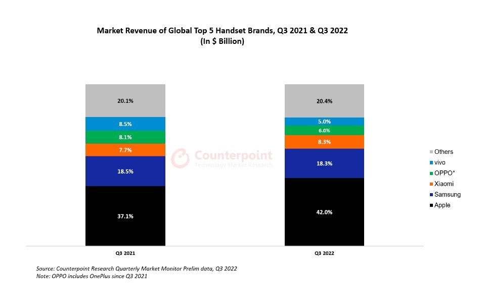 According to Counterpoint Market Research, the global smartphone revenue in Q3 2022 went down by 3% YoY (year-on-year), while the smartphone market also saw a 12% YoY dip in handset shipments for the quarter. The decline could have been worse, but it was avoided thanks to Apple's iPhone 14 series, which saw 10% YoY revenue growth and 7% average selling price (ASP) growth in Q3 2022. Apple's growth contributed to the overall increase in the global handset ASP.