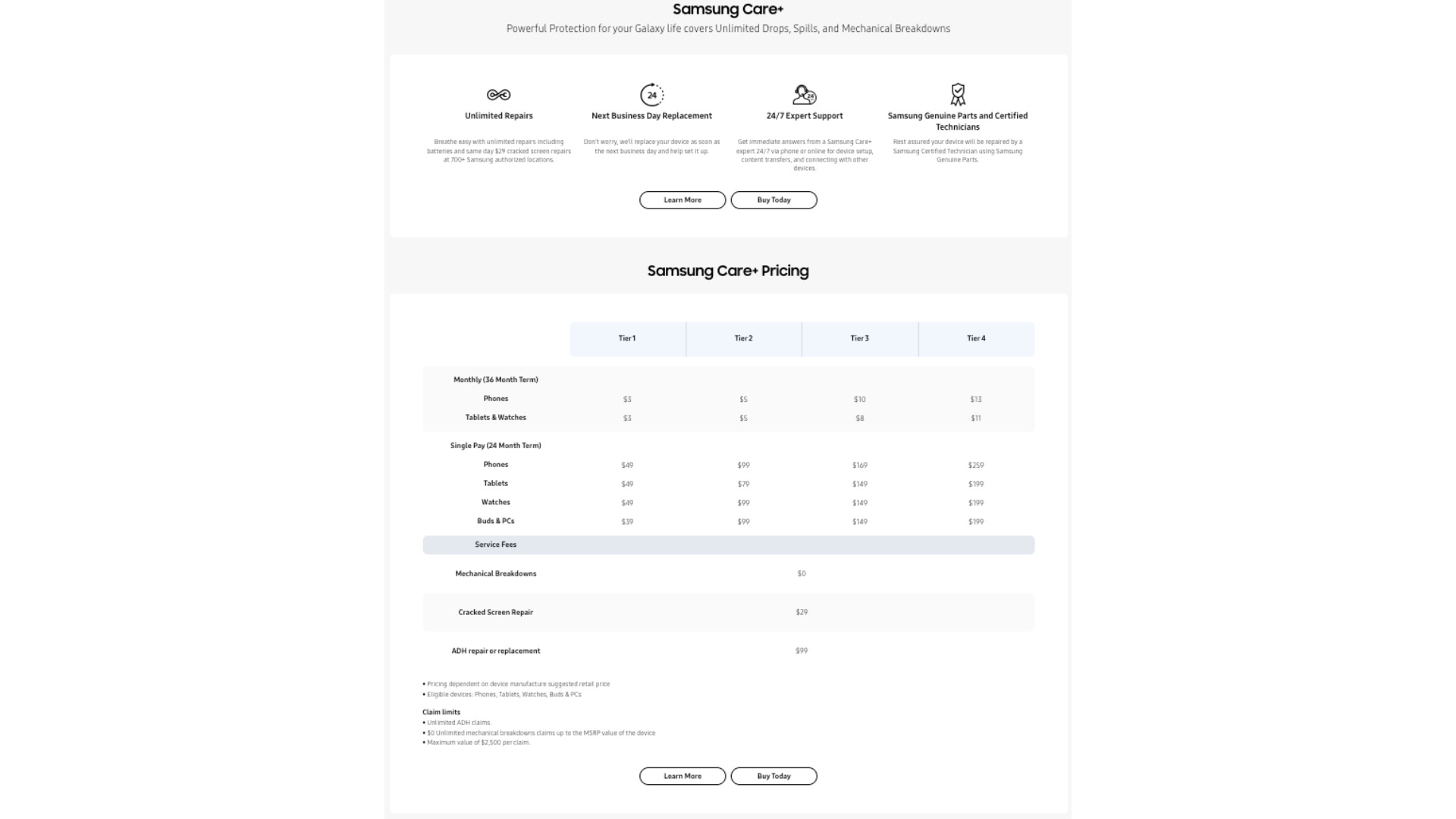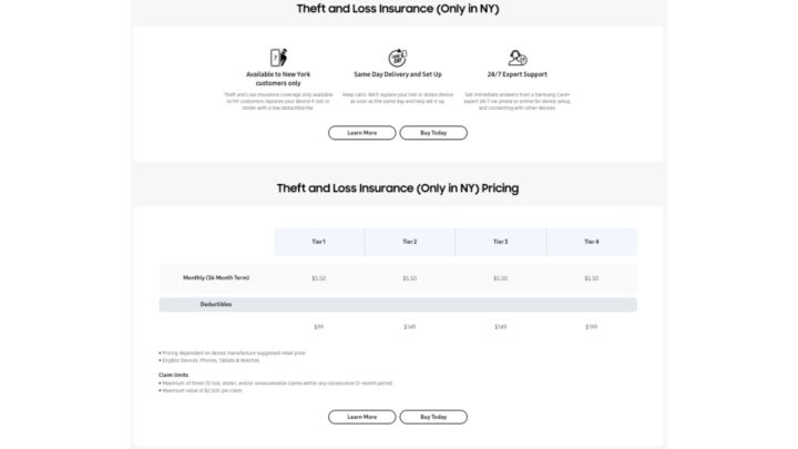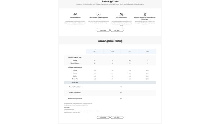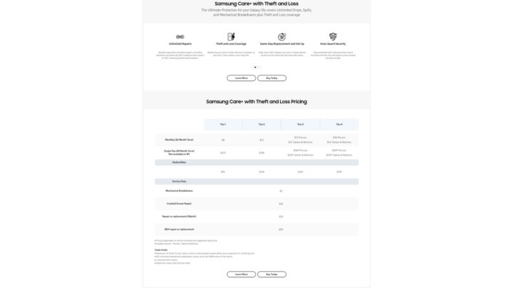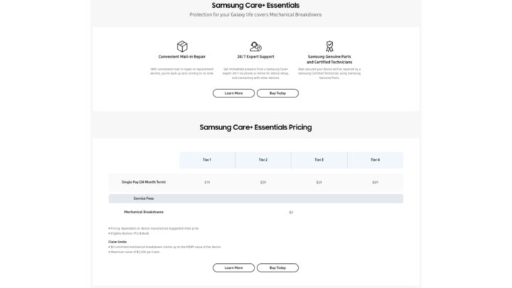 There are four plans you can choose from: Samsung Care+ Essential, Samsung Care+, Samsung Care+ with Theft and Loss, and Theft and Loss Insurance. The first plan covers only mechanical breakdowns. The second plan offers accidental drop and spill protection in addition to what the first plan covers. The third plan adds coverage for the loss or theft of the device to the second plan. The fourth plan covers only the loss and theft of the device. You can check out the details and pricing of the four plans in the images below.