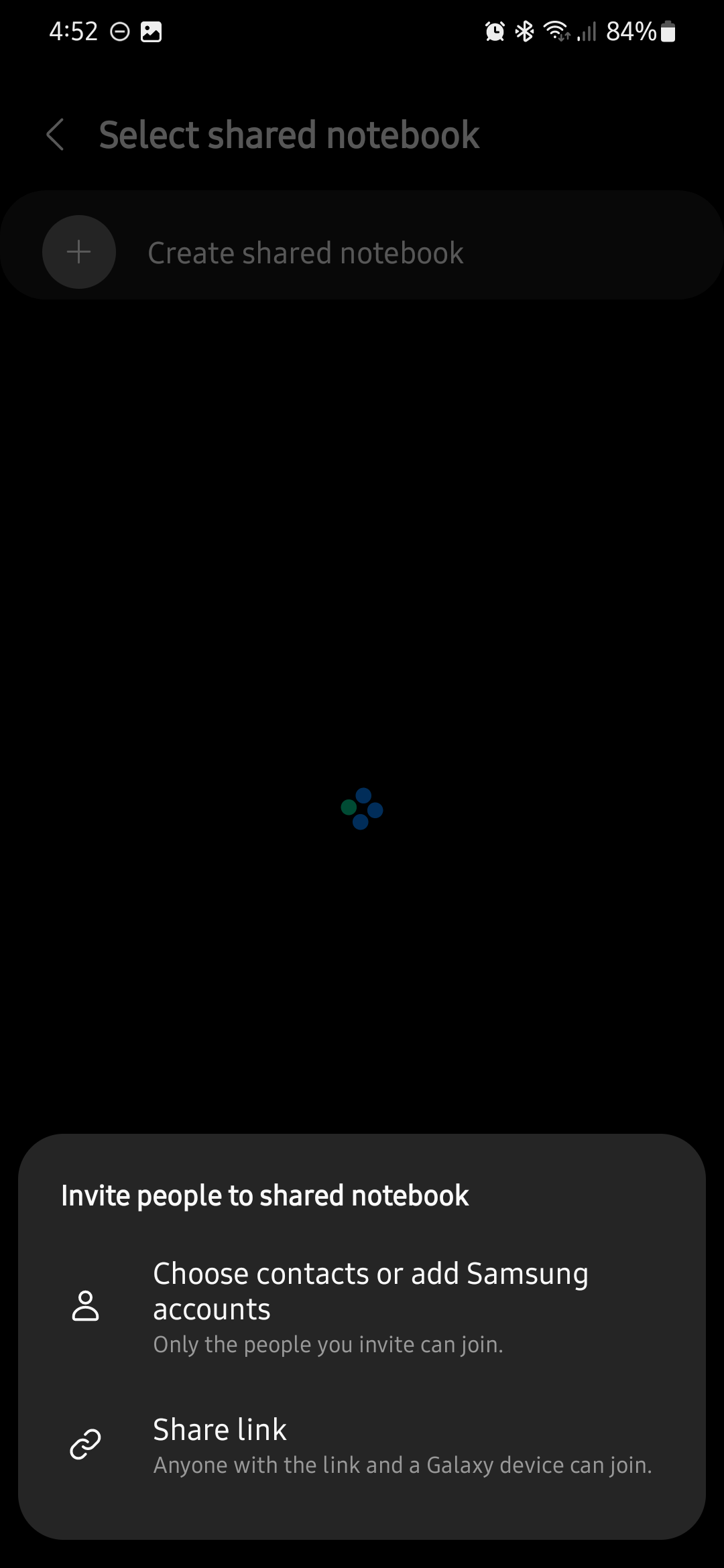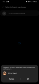 Assuming you don't already have a shared notebook, tap “Create shared notebook” and enter a name, then tap “Add.” Next, choose how you want to invite people to the shared notebook. You can choose contacts or add Samsung accounts, or you can share the notebook through a direct link. Tap “OK” when notified that people will be able to see your name and profile picture, and then select the desired sharing method and/or contacts to complete the process.