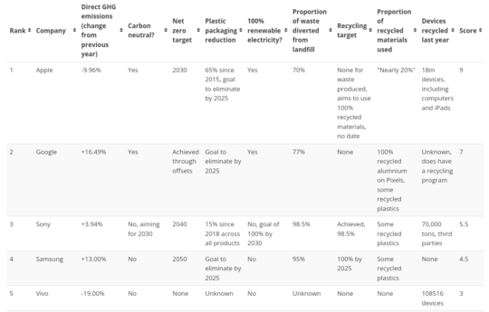 Apple ranked 1st because it has achieved carbon neutrality and has a 2030 net zero target. The Cupertino-giant and Google have also achieved 100% renewable energy, while Samsung has not. And while Apple lowered its direct GHG (Greenhouse Gas) emissions by 9.96% compared to a year ago, Samsung's GHG emissions increased by 13% over the same time period.