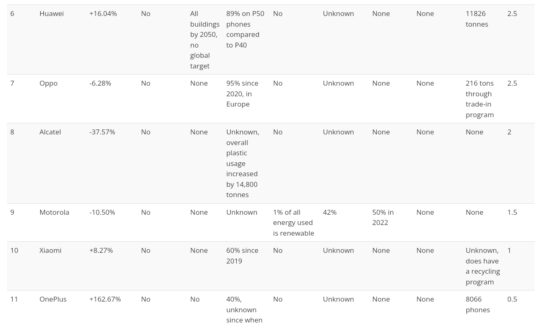 Smartphone manufacturers trailing behind Samsung are Vivo, Huawei, Oppo, Alcatel, Motorola, Xiaomi, and OnePlus. The latter company ranked 11th and increased its GHG emissions by a whopping 162.67% over one year.