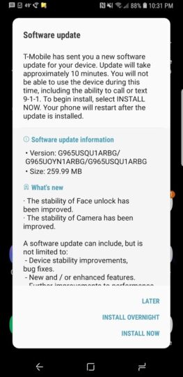 Multiple people have reported receiving this T-Mobile Galaxy S9 update on Reddit. The carrier is sending out firmware version G960/G965-USQU1ARBG for the Galaxy S9 and the Galaxy S9+ on its network. It weighs in at 259.99 MB and even though it's a fresh release, it doesn't seem to include the March 2018 security patch that has already been released for the G960/G965F models last week.