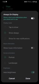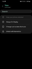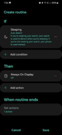 Next, tap the “Then” field and select “Lock screen,” followed by “Always On Display.” Tap the AOD toggle OFF and tap “Done.” Lastly, tap “Save” to create the Routine.