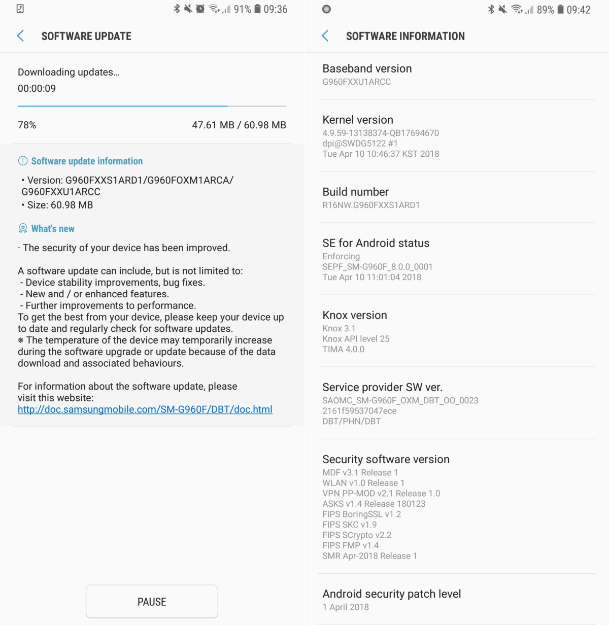 Now, about that security patch: The April 2018 patch brings fixes for seven critical Android vulnerabilities and eight vulnerabilities that affect Samsung's software. If you own a Galaxy S9, you can see if the update is available in your country by going into the Software update menu in your phone's Settings app and tapping Download updates manually. The full firmware for the latest update is also available in our firmware database, and you can also use Samsung's Smart Switch program on a PC to grab the latest update.