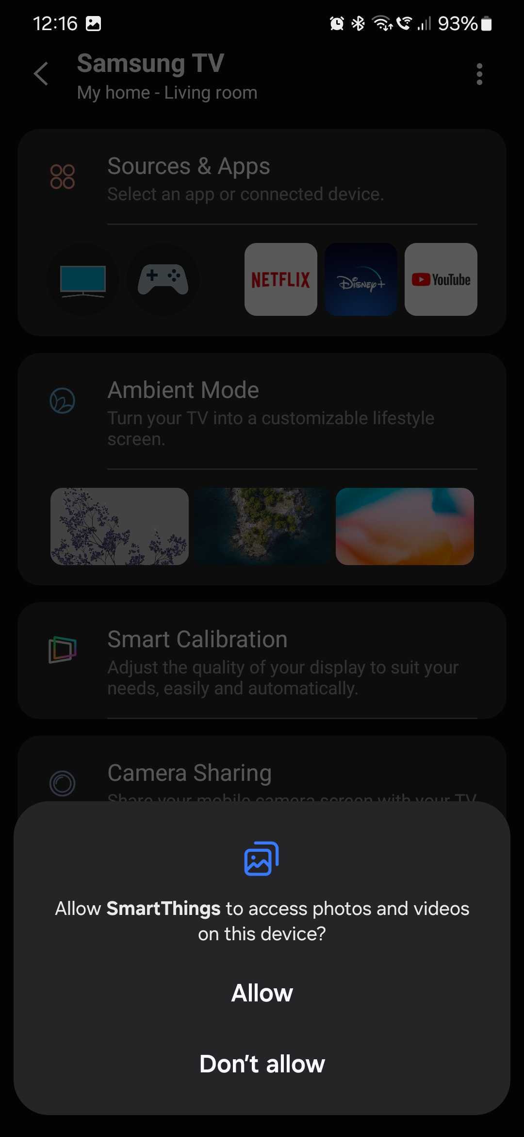 Launch the SmartThings mobile app and select your TV. If necessary, use the SmartThings remote to turn the TV ON. Then go to “Camera Sharing” and tap “Allow” when asked if you want SmartThings to access photos and videos on your device.