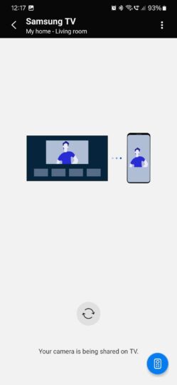 Your Galaxy phone or tablet is now connected to the Samsung smart TV and functions as a webcam. You can now use apps like Workout and Google Meet on your TV, and you can use the UI on your mobile device to switch between its front and rear cameras.