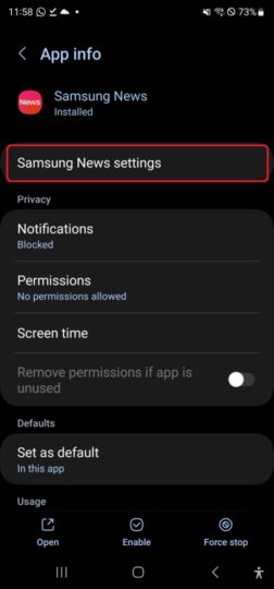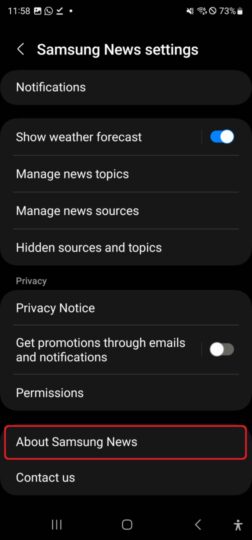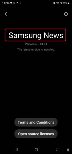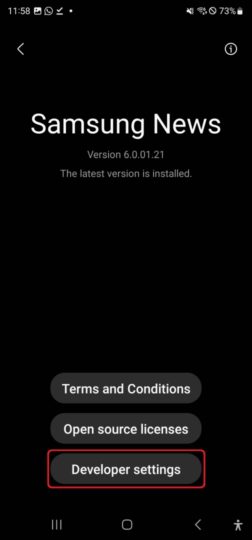 First, you would have to download the Samsung News APK installation file from here and install it on your device. Once you install the Samsung News APK file on your Galaxy smartphone, press and hold the Samsung News app icon in the app drawer and click the i icon on the top right corner of the pop-up menu. Then, tap on Samsung News settings and scroll down towards the end and tap on About Samsung News.