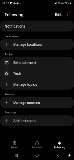 The app has three main sections: News, Podcasts, and Following. You can follow any news source that you like, and all those followed news sources will show up in the Followed section of the app. You can opt-in to get alerts for breaking news stories. You can also manage news topics such as business, cars, culture, entertainment, lifestyle, music, news, politics, science, sports, tech, travel, and more.
