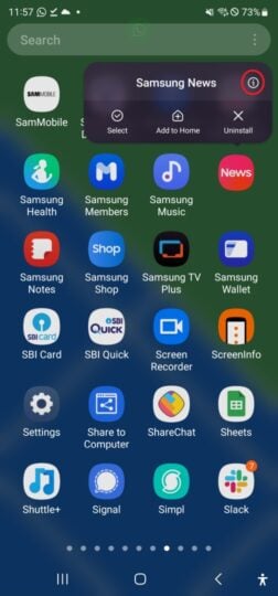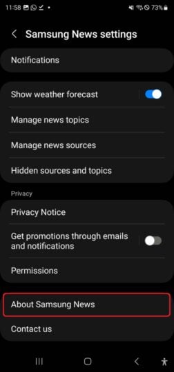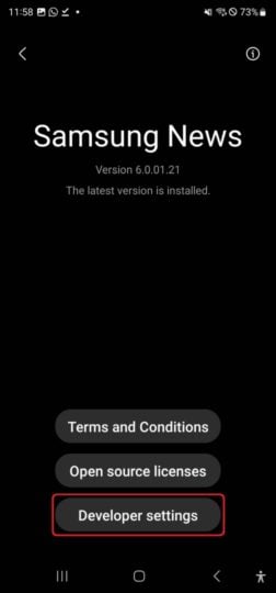 First, you would have to download the Samsung News APK installation file from here and install it on your device. Once you install the Samsung News APK file on your Galaxy smartphone, press and hold the Samsung News app icon in the app drawer and click the i icon on the top right corner of the pop-up menu. Then, tap on Samsung News settings and scroll down towards the end and tap on About Samsung News.