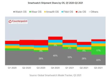 Apple's wearable software platform (Watch OS) had a 22% market share at the end of Q3 — 5% higher than Wear OS. However, Watch OS lost significant market share throughout the year and dropped from 40% in Q4 2020 to 33% in Q1 2021, slipping further to 28% in Q2.