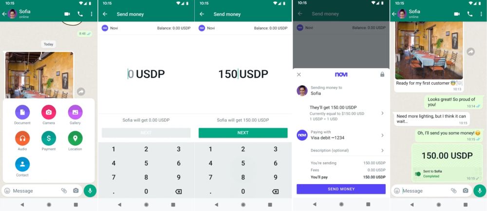 Users only have to tap the attachment icon and select the “Payment” option. They can then specify the amount of USDP they wish to send to the respective contact via Novi, tap “Next,” and confirm by pressing the “Send Money” button. The completed transfer will then show up in the WhatsApp conversation like any other message or attachment.