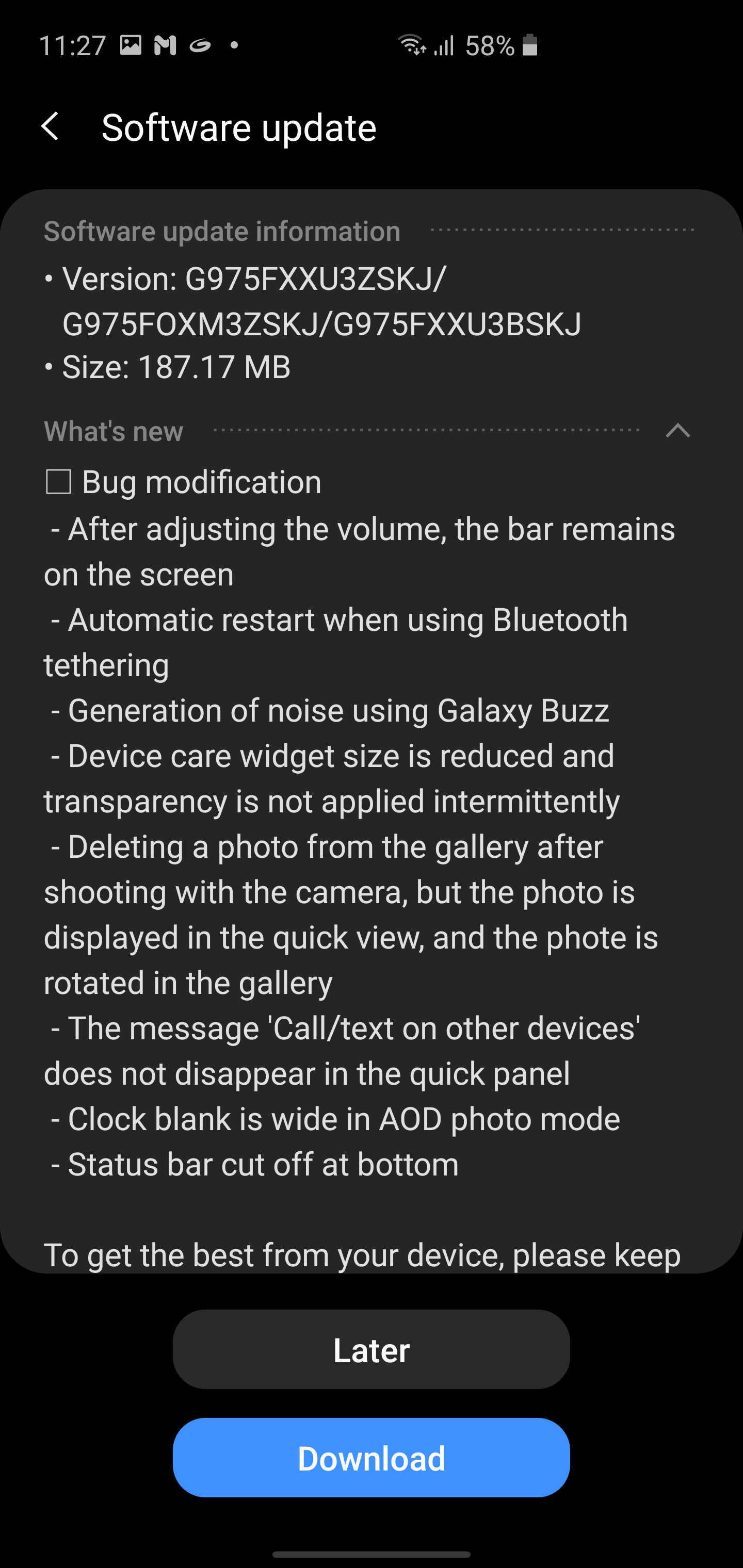 The Galaxy S10 beta that's rolling out today has software version G97**XXU3ZSKJ and seems to be available in all countries where the beta program is active. That includes Germany, India, France, Spain, Poland, the UK, South Korea, and the US, although the update may not be available in the US right away because of the difference in time zones. The update includes fixes for a few bugs, such as device restarts when using Bluetooth tethering, volume control bar not going away after volume is adjusted, and the status bar getting cut off at the bottom.