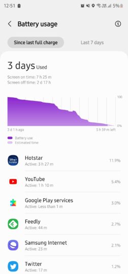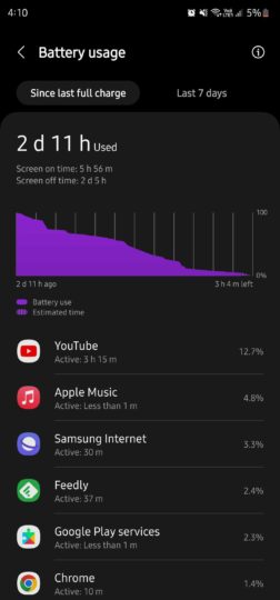 I frequently keep checking RSS feeds for news and other stories, have two email accounts synced, and have online banking and shopping apps. I also have all the popular social media and messaging apps, and I mostly use Instagram, Slack, Twitter, and WhatsApp. I also stream music on Apple Music and Spotify for at least two hours every day and stream videos on Disney+ and YouTube. And that is mixed with a few calls, GPS navigation, and some gaming.