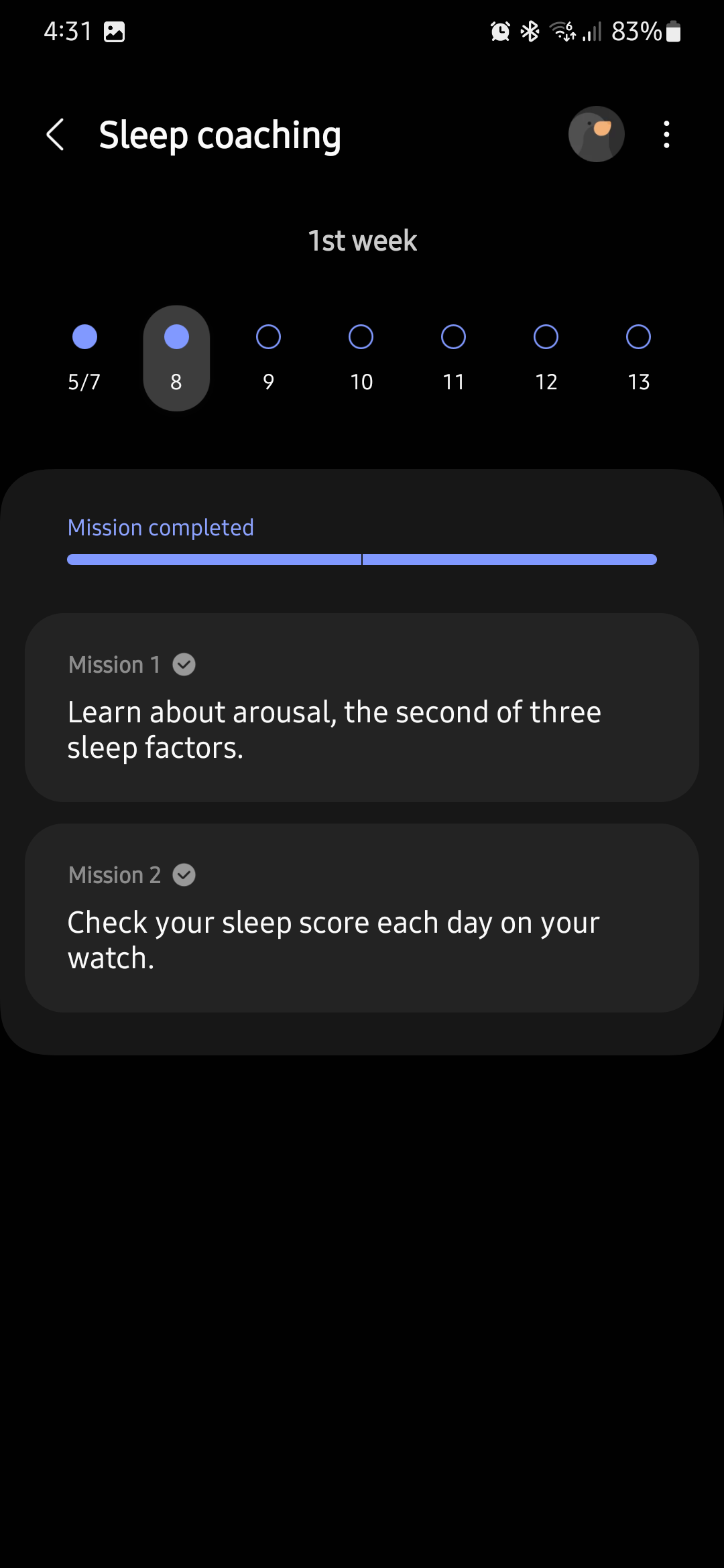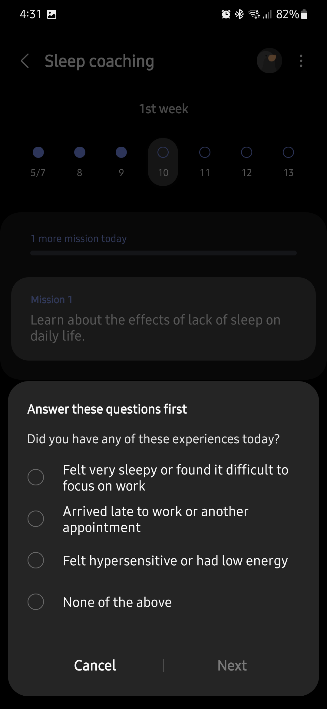 By the time I catch up on these mandatory quizzes, it's all in the past, and I, for one, can't remember how I slept or how I felt waking up in the morning five days ago. If you're anything like me, at that point, your only realistic option is to pick an answer randomly so you can move on to the next lesson, which means you're cheating yourself out of sleep coaching.