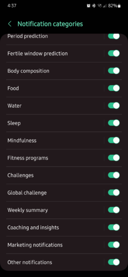 No matter how you want to look at it, I'm saying that Samsung Health can send push notifications for numerous features and fitness parameters. And I don't see why the app doesn't give us the option to enable daily notifications for Sleep Coaching. And, no, it makes no difference if you turn on notification categories like “Sleep,” “Challenges,” and “Coaching and insights.”