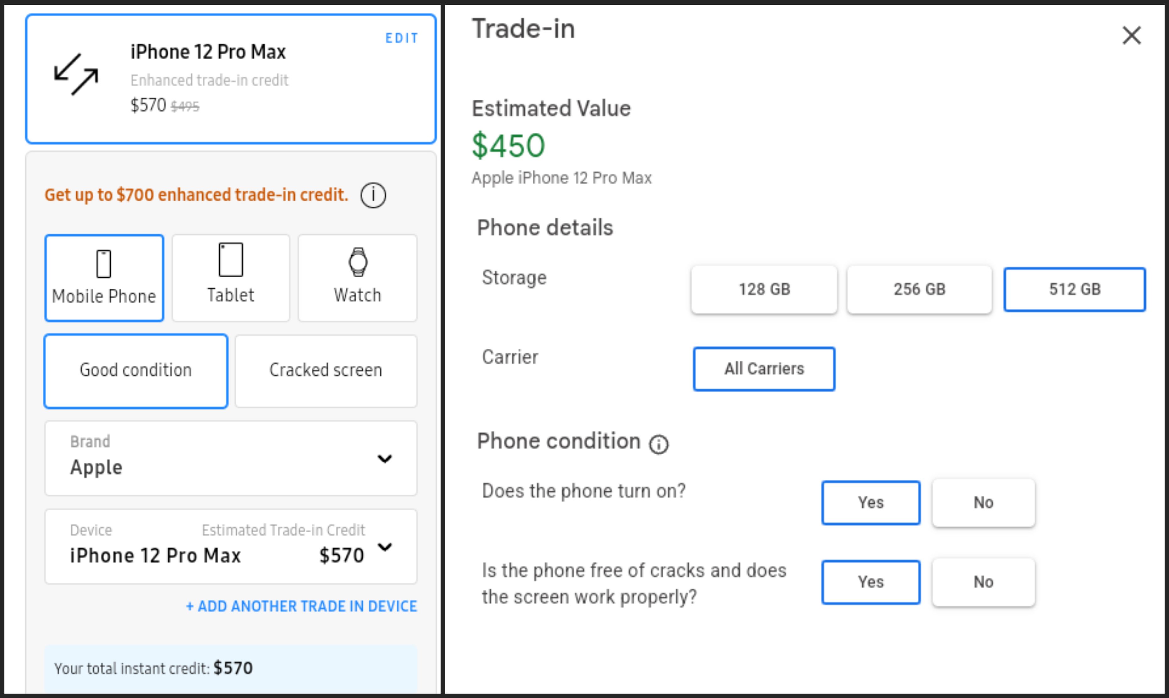 Meanwhile, Samsung offers you $570 for the iPhone 12 Pro Max if you trade it when you buy the Galaxy S22, Galaxy S22+, or Galaxy S22 Ultra. The same is true for other models and brands, so, back to the original point, Samsung's trade-in values are usually better than Google's.
