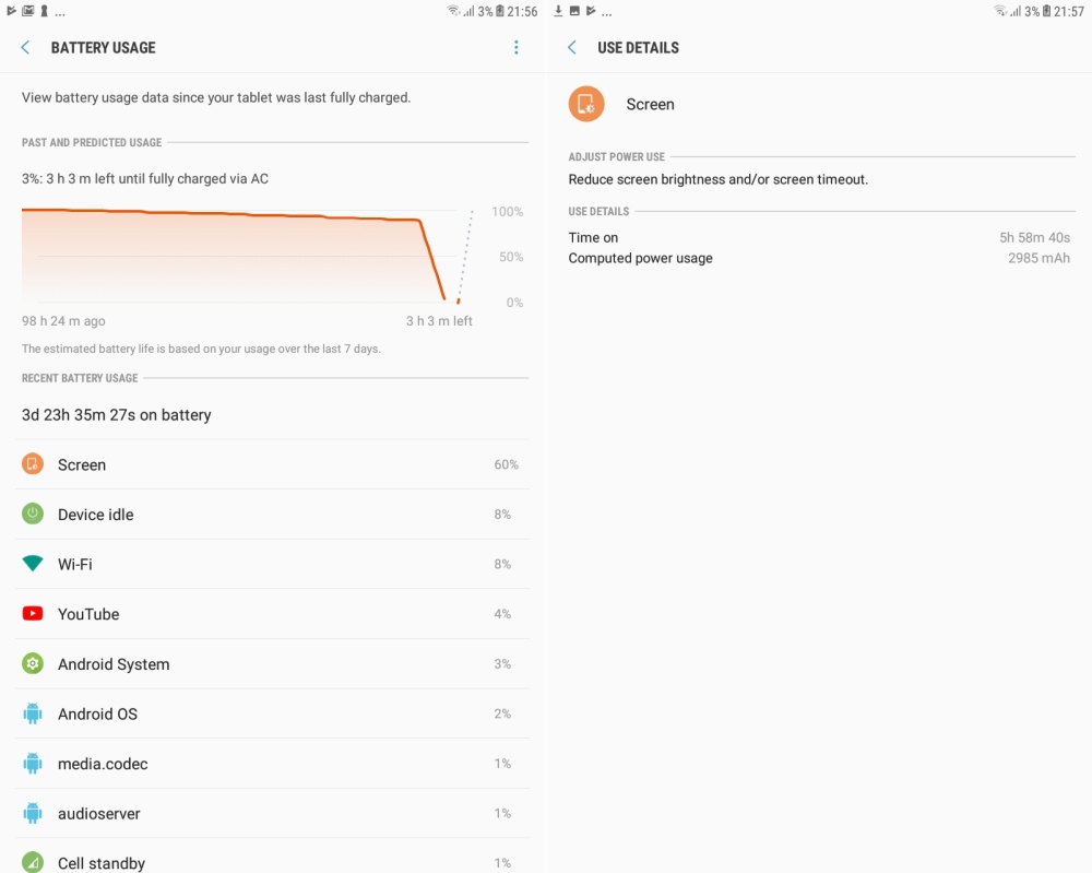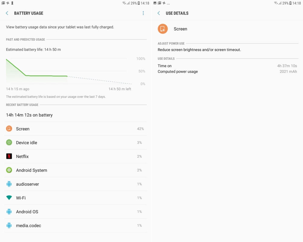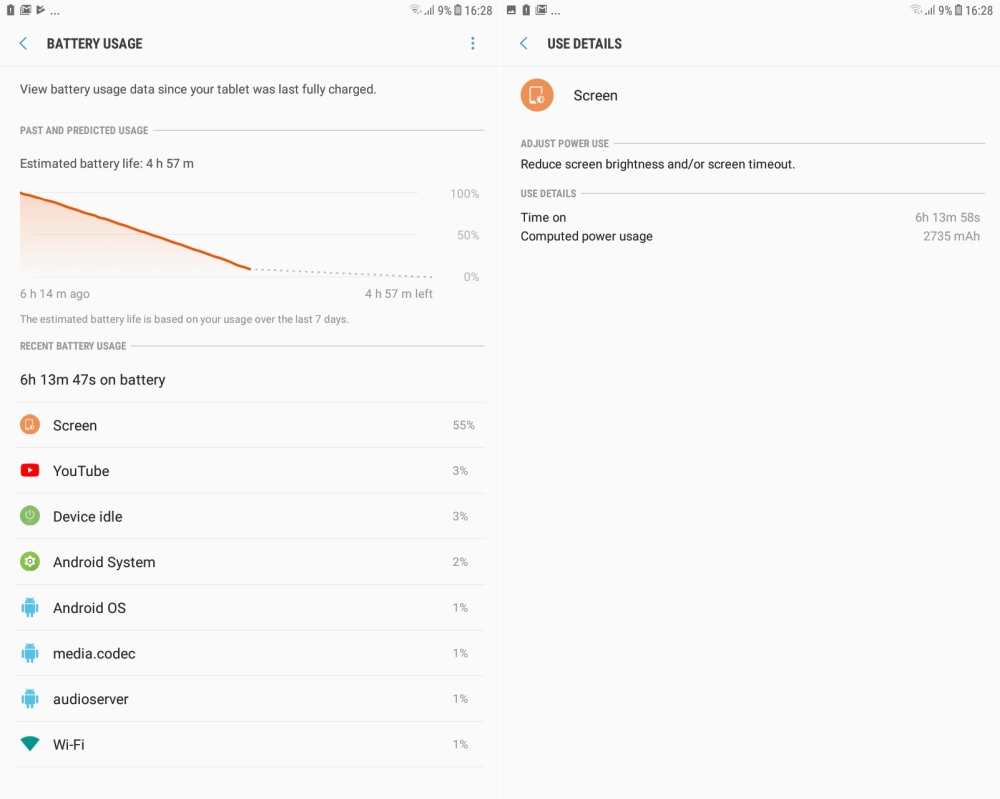 I don't know where Samsung gets the 14-hour video playback figure that it touts for the Galaxy Tab A (2017), because for me, 7 hours was the extent to which the tablet was able to continuously play videos for me over a Wi-Fi connection. The 5,000 mAh battery lasts insanely long when the tablet isn't used for a few days, as it should given the meager hardware it has to power, but battery life isn't as good as you'd like when you're binge-watching the second season of Stranger Things on Netflix.