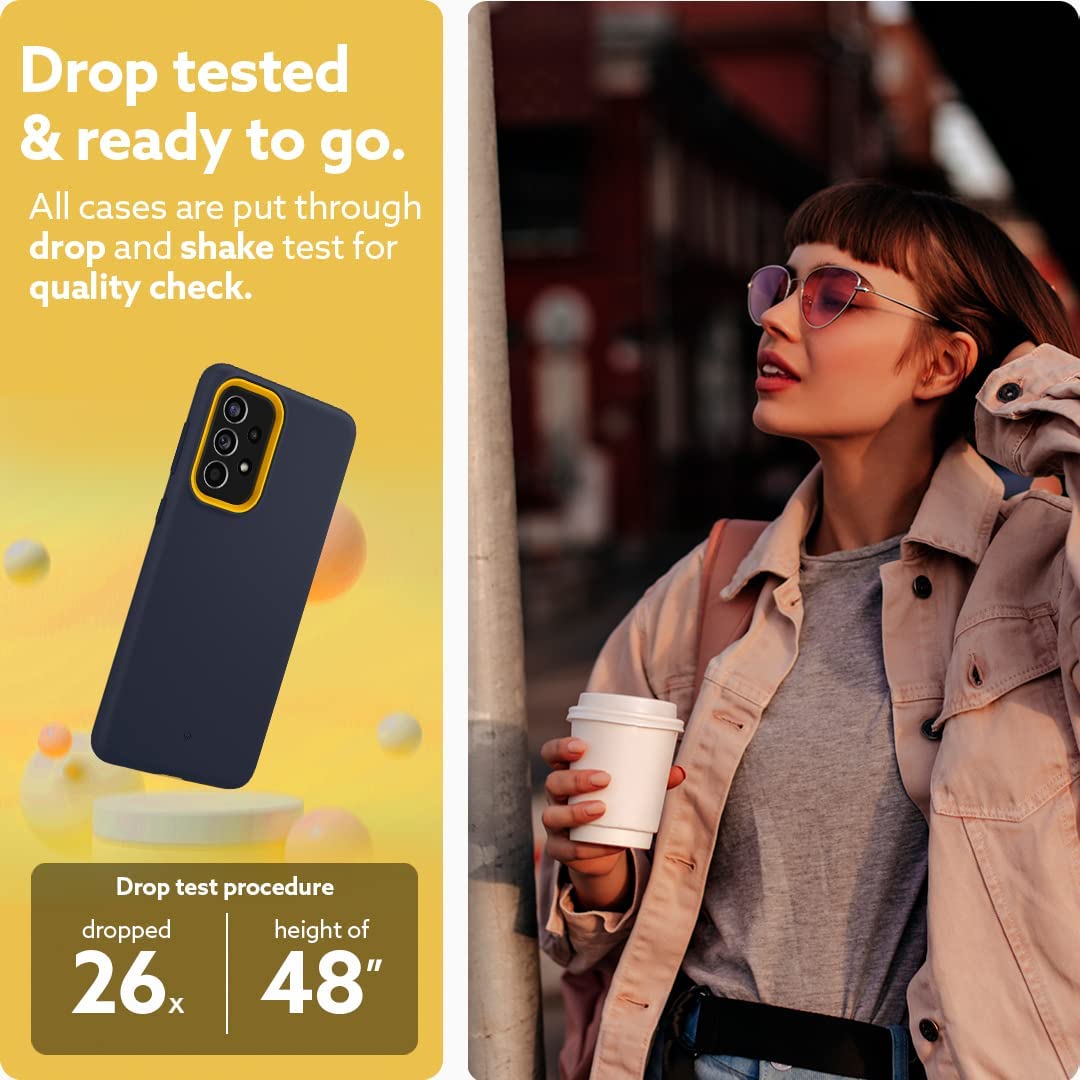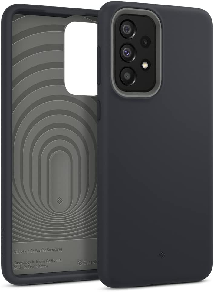 The Caseology Nano Pop silicone case for the Galaxy A33 has the established Caseology design with a dual-color combo. The case's exterior is black or navy, and the interior color that splashes around the camera housing is gray or yellow. The case has a slim-fit design and promises military-grade protection and wireless charging compatibility.