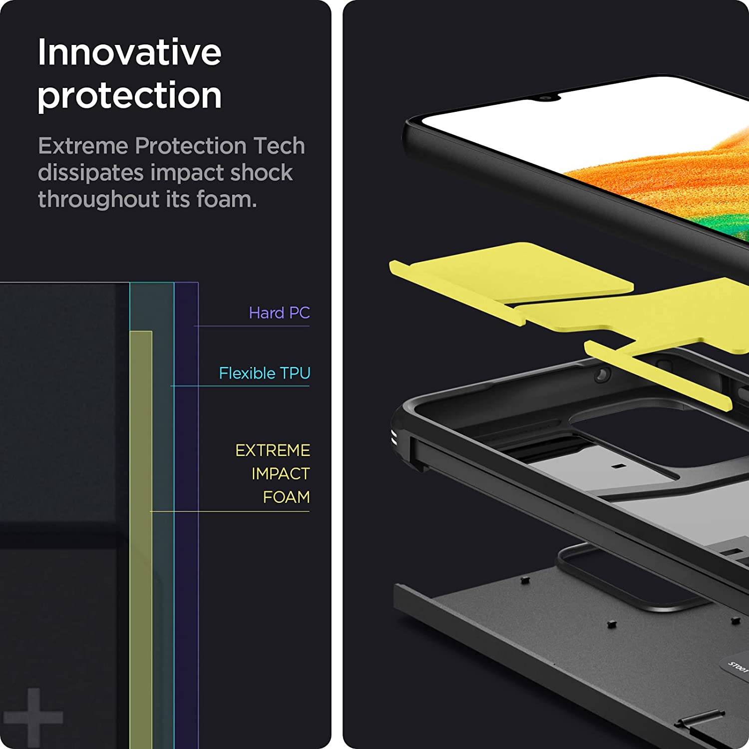 The Spigen Tough Armor for the Galaxy A33 has an all-new foam technology that adds an extra layer of resistance against shock. This case is equipped with a kickstand and is MIL-STD 810G-516.6-certified. It has Air Cushion technology and a TPU and Polycarbonate dual material construction.