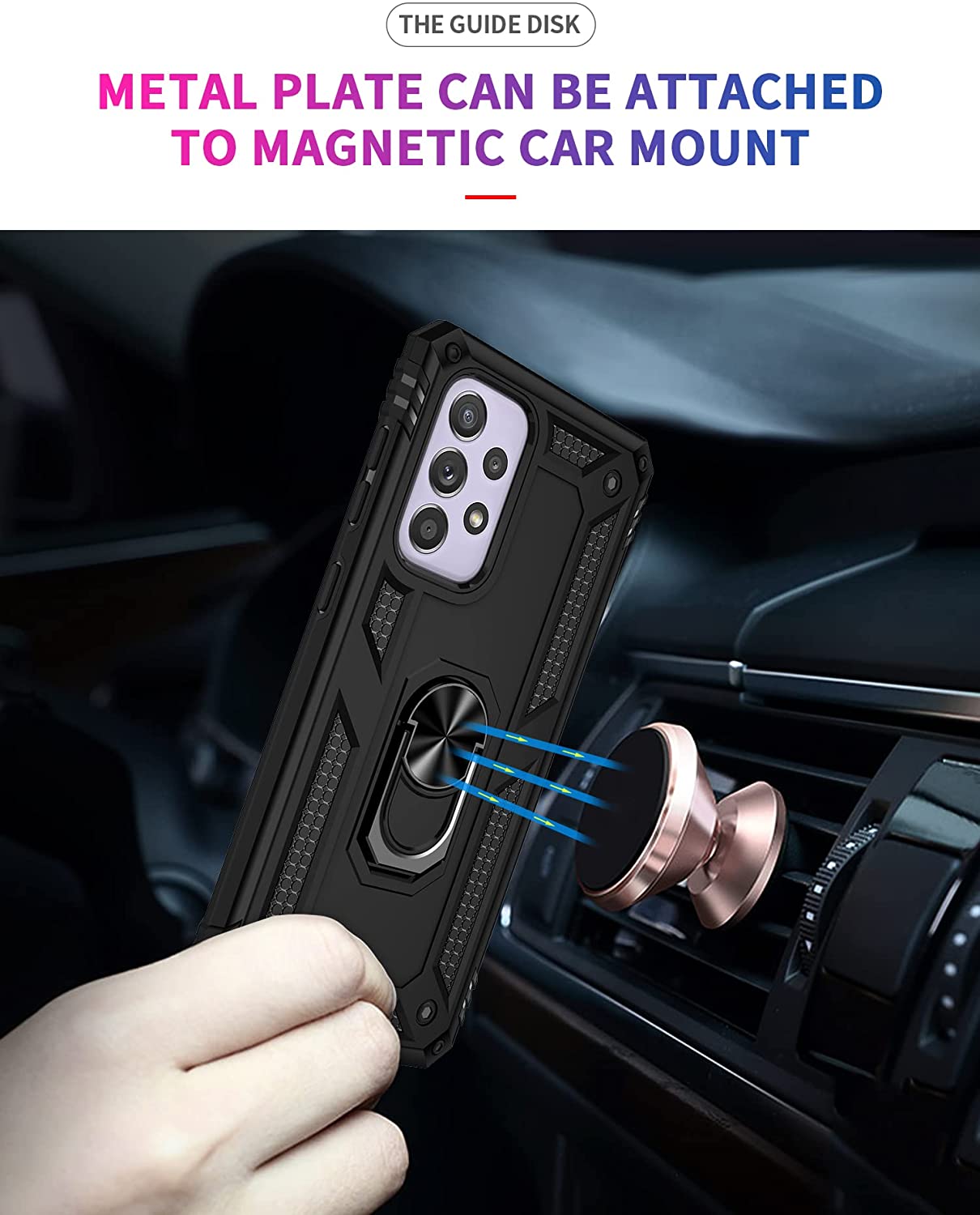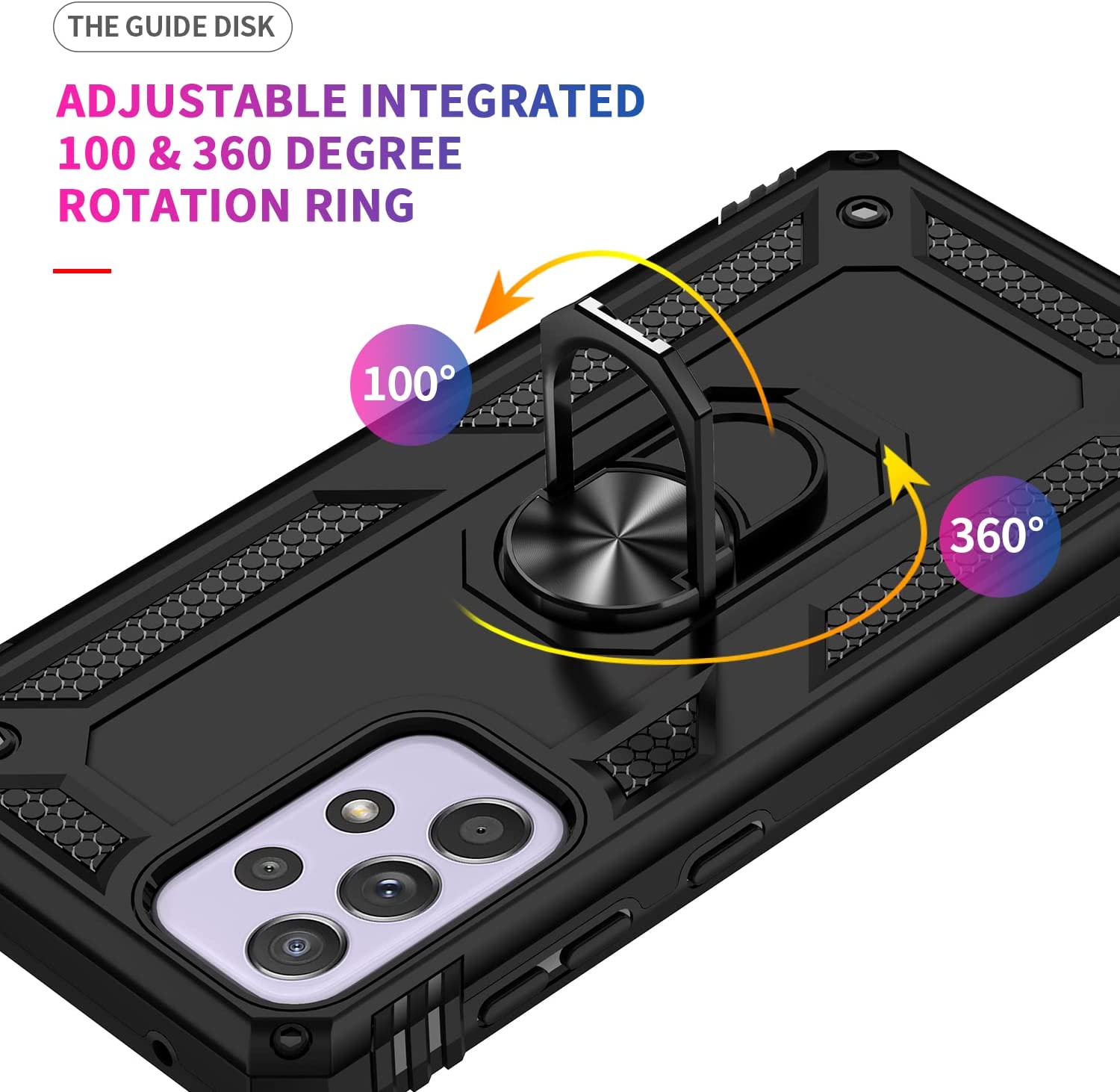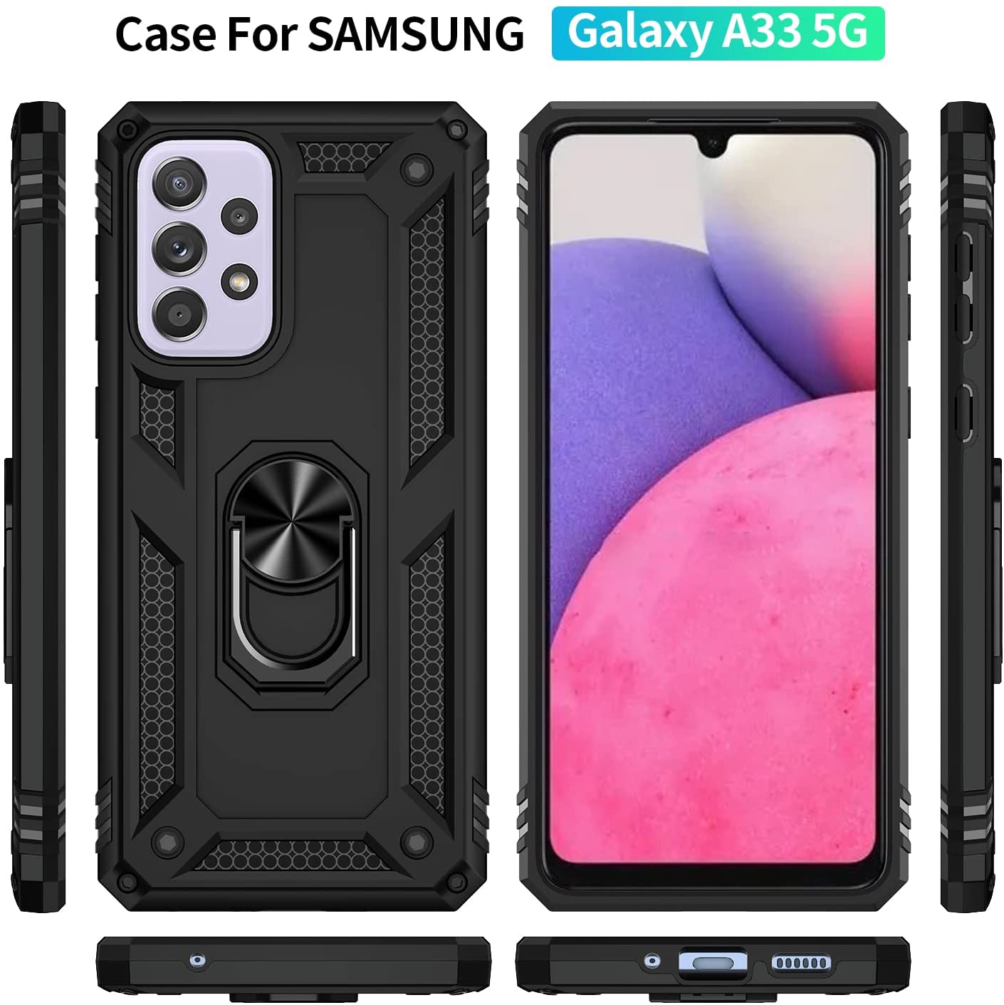 The Probeetle Galaxy A33 case offers lots of features for the price, including a built-in magnetic car mount, an adjustable ring kickstand, and a 2-pack screen protector. It has military-grade protection and Air Cushion technology at all four corners to protect from shock damage. The case is available in four color options: black, blue, green, and red.