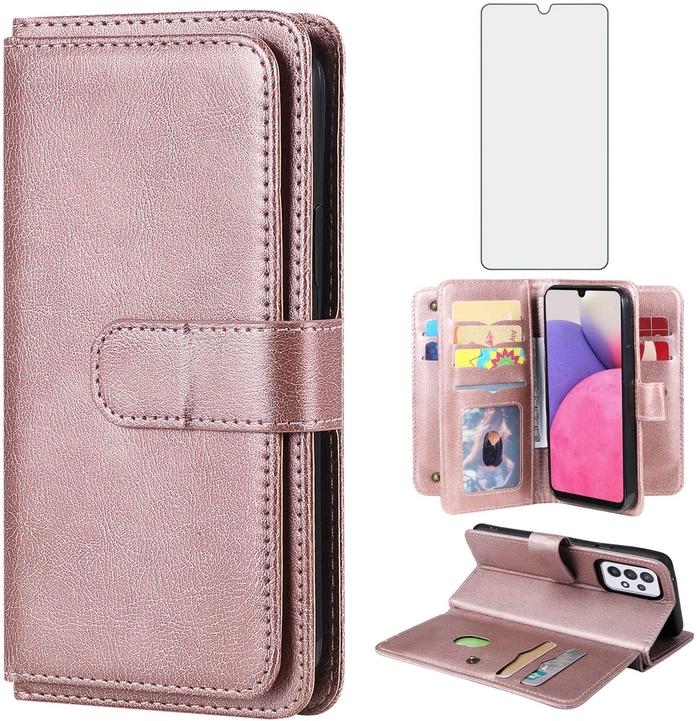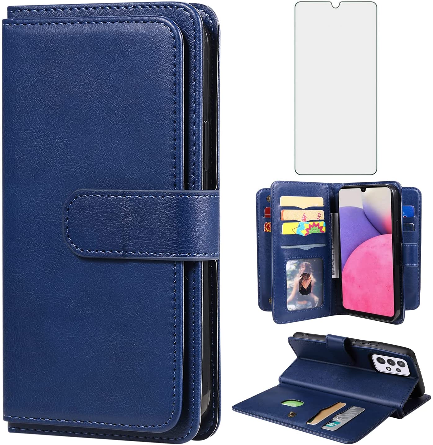 This Galaxy A33 case has a wallet design with ID and credit cardholders (up to 10), a money pocket, and a multi-angle kickstand. The case has a secure magnetic snap, and it's available in four color options to better match the colorful Galaxy A33. Colors include black, blue, purple, and rose gold.